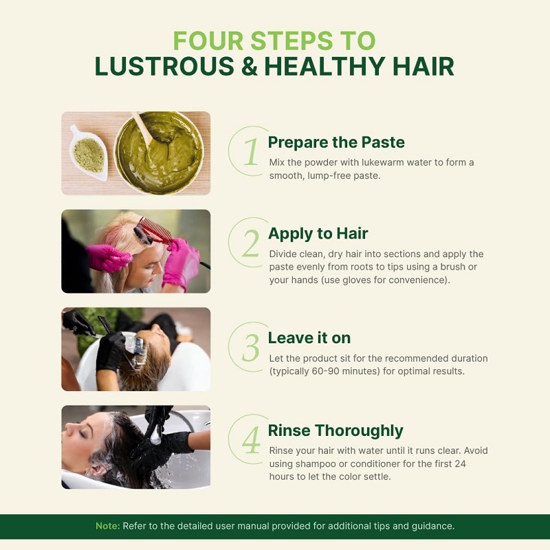 | How to Use | Step 1 Paste Preparation : 1. Each jar of Radico Colour Me Organic Hair Colour is 100g. Determine the usage amount based on hair length. Short Hair: 20g to 30g Shoulder Length Hair: 40g to 60g Long Hair: 70g to 100g 2. Use warm water. Use pure drinking water or distilled water for best results. 3. Prepare a suitable container and stirring rod. (Please avoid using metal bowls or spoons during the preparation or application of the paste). 4. Place the hair colour powder in a container. Add the hot water into the powder gradually, in small amounts. Mix well to obtain a uniform ketchup or yogurt-like consistency. The ratio of powder to water is approximately 1:3. If the mixture becomes too thin, add small amounts of powder to achieve the correct consistency. Step 2 Colour Application : 1. After a thorough hair wash, towel dry hair and when the hair are still slightly damp, begin applying the paste from the roots along the hair length using the brush or even by hands. Make sure to cover all hair really well. Very grey or short hair is best covered by using thicker paste. 2. After applying the paste fully and evenly, apply heat with a blow dryer for few minutes. Then, cover the hair with a disposable shower cap. The heat application may be repeated 2 to 3 times every 15-20 minutes without removing the shower cap. Please note that this step is optional, but highly recommended. Heat activates the organic herbs in the paste, which helps to enhance the nourishing and the colouring process. Step 3 Application Time : The colouring paste should be left on the hair for 60 to 90 minutes. (Grey hair may take longer to achieve the desired effect. For grey or white hair, the paste can be left for up to 2 hours. Because the paste is natural, it will not damage the scalp.) Step 4 Rinse : 1. After completing the colouring process, rinse the hair with running water (do not use shampoo or conditioner) until the hair is clean. 2. To achieve the best results, we recommend using colour retention shampoo/conditioner only after 24 hours. A natural and gentle colour retention shampoo/conditioner is highly recommended. 3. DO NOT use clarifying shampoo after hair colouring (clarifying shampoo can only be used before the hair colouring to remove the hair buildups and grease. Colour retention shampoo should be used after the hair dye is applied). |